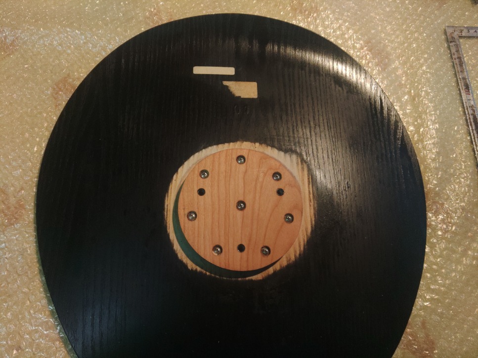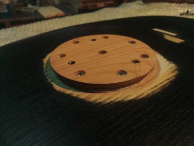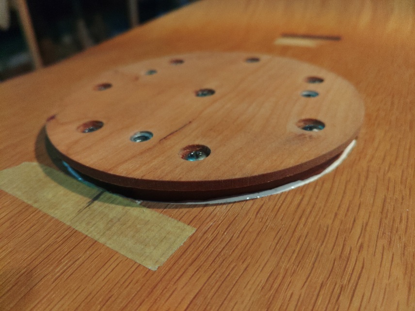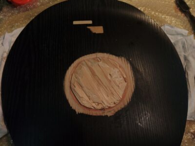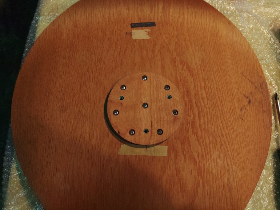 座面が曲面で電動工具が使いにくいので、ノミで少しずつ削って取り除き平らにして木のパーツを取り付けました。
