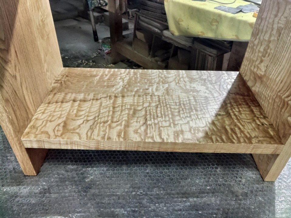 今回は棚板に縮み杢とも呼べるような個性的な材料を使用しました。非常に珍重な材ですがクセが強すぎるのであえて天板ではなく棚板にしました。