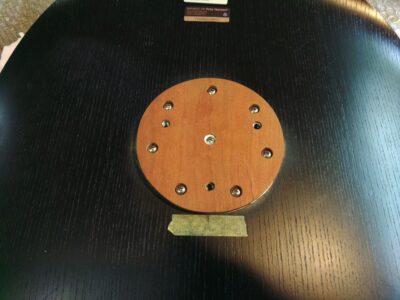 最初についているプラスチックパーツの代わりに、当工房が製作したチェリー無垢材のパーツを木工最強ボンドPIボンドをつけて複数個のネジで接着して修理します。木と木の接着なので高い強度が期待できます。